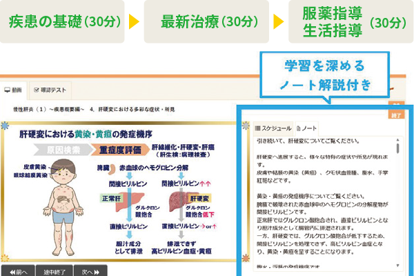 MPラーニングでは60疾患以上を「疾患の基礎」「最新治療」「服薬指導・生活指導」の3本で構成し、統一感をもって理解できる体系的な内容を独自に 制作しています。疾患別の知識を点ではなく、横断的に学ぶことができます。